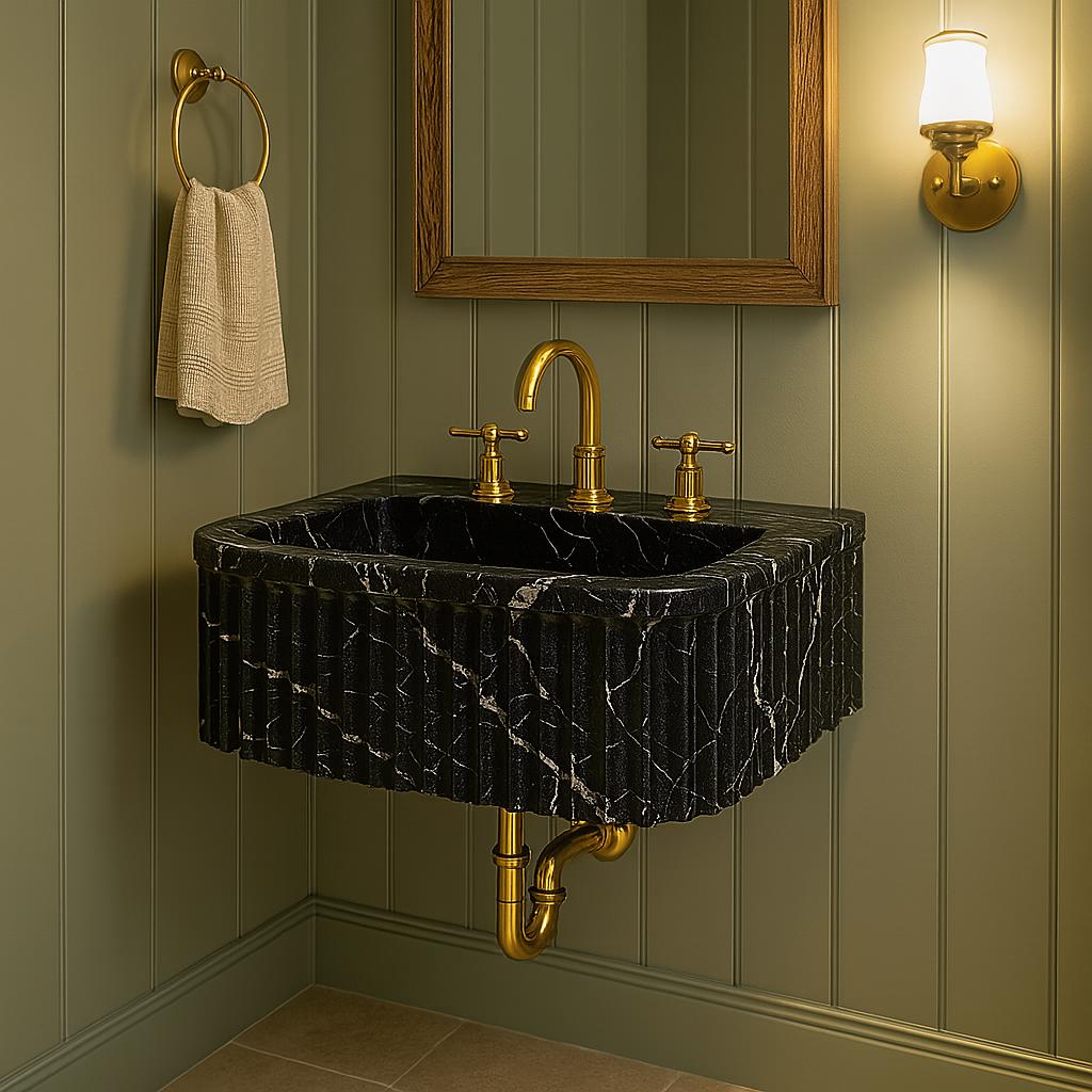 This handcrafted sink is sculpted from premium black marble featuring striking white veining and an elegant fluted exterior. Mounted directly to the wall and paired with brass plumbing fixtures, it offers both sophistication and functionality.