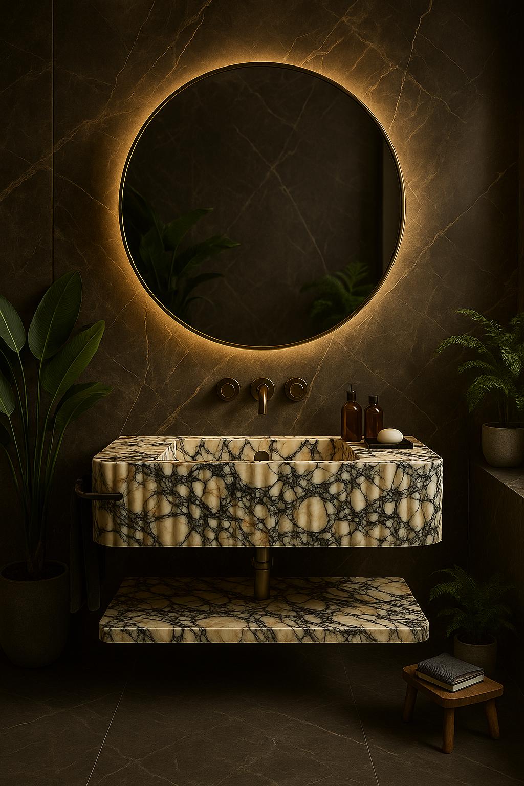 Bring timeless Italian elegance into your home with this handcrafted marble sink, inspired by classic Italian bathrooms. Featuring bold veining on a warm beige stone and a matching fluted shelf, this wall-mounted sink is both a functional and artistic centerpiece. Its sculptural, minimal form reflects the refined charm of high-end Italian interior design.