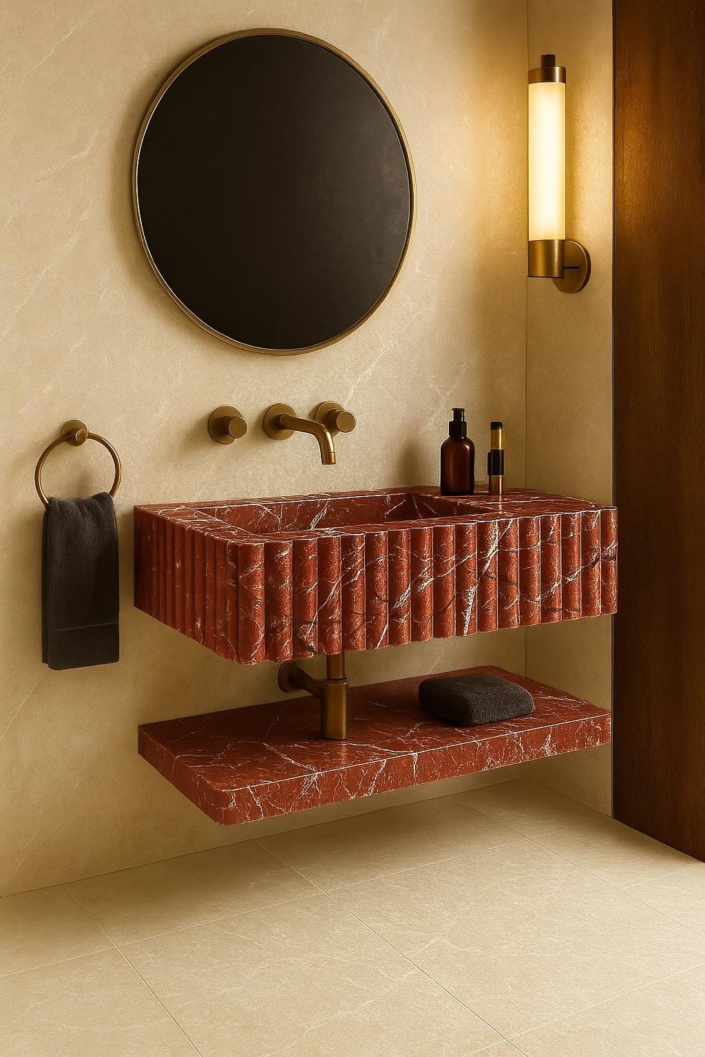 Elevate your bathroom with this bold and sophisticated fluted marble sink, handcrafted from rich burgundy Rosso marble. With elegant white veining and deep tonal contrast, it’s the perfect statement piece for luxury interiors, modern hotels, or high-end residential projects. Interior designers love its sculptural presence and timeless appeal.