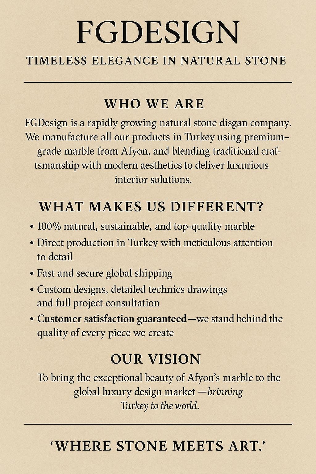 Absolutely! Each piece we create can be fully customized — including size, marble type, fluting style, backsplash height, faucet hole placement, and more. Whether you’re a homeowner, designer, or architect, we’ll tailor every detail to fit your project perfectly.