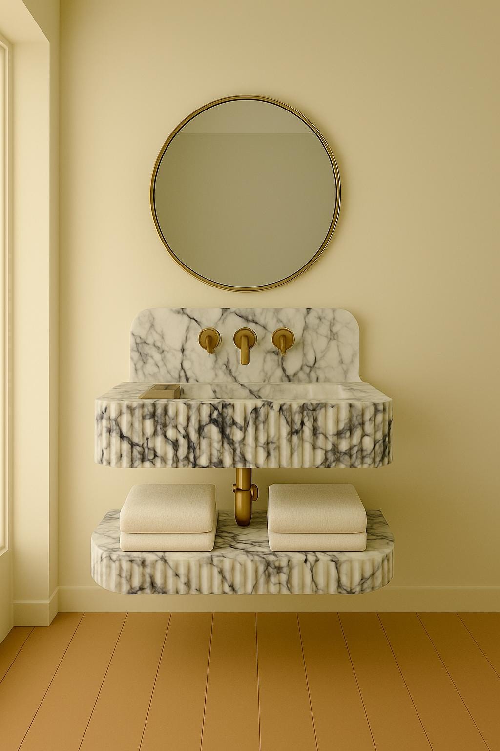 This sculptural marble sink is designed to transform any bathroom into a luxurious retreat. Featuring a fluted front panel, integrated marble backplate, and clean wall-mounted installation, this sink is a perfect blend of modern minimalism and timeless elegance.